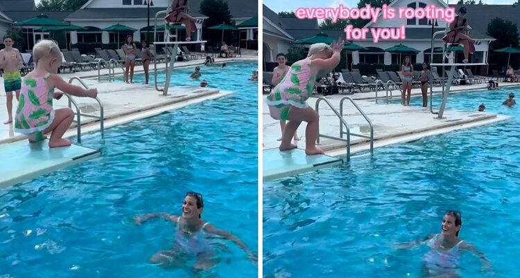 Малечкото девојче е на базен со својата мајка, а на видеото се гледа моментот кога тоа стои на даската за скокање, додека нејзината мајка ја чека во базенот.