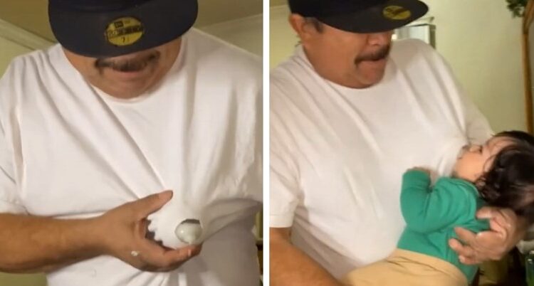 Кога се обидувате да натерате доено бебе да земе шише, понекогаш ќе наидете на отпор и можно е бебето да одбива таков начин на хранење. Еден дедо создал свој метод кој изгледа одлично за детето, но и обезбедува забава и смеа за сите останати.
